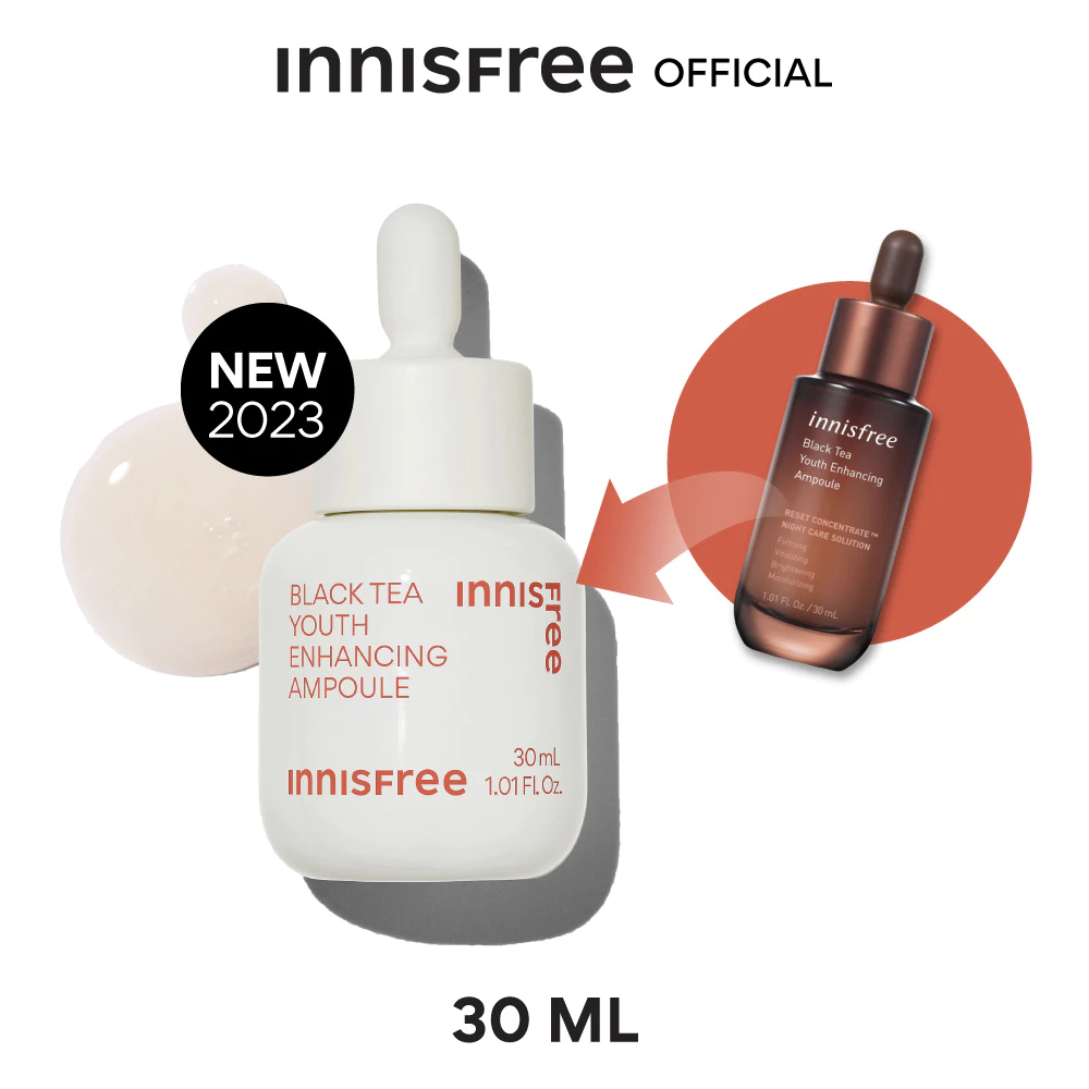 Innisfree Black Tea Ampoule แอมพูล กู้ผิวเร่งด่วน ที่โดดเด่นด้วยเทคโนโลยีเฉพาะอย่าง Reset Concentrate™ ซึ่งเป็นสารสกัดเข้มข้นจากชาดำเชจูที่ผ่านกระบวนการหมักบ่มจนได้สารต้านอนุมูลอิสระที่มีประสิทธิภาพสูง หัวใจสำคัญของขวดนี้คือการ “รีเซ็ต” ผิวที่อ่อนล้าจากความเครียด พักผ่อนน้อย หรือมลภาวะ ให้กลับมาดูสดใส มีชีวิตชีวาเสมือนได้นอนเต็มอิ่ม พร้อมทั้งช่วยต่อต้านริ้วรอยแรกเริ่มได้อย่างตรงจุด