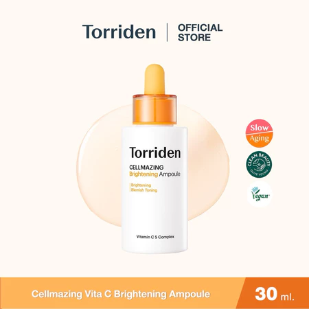 Torriden Cellmazing Vita C Brightening Ampoule แอมพูล วิตามินซีเข้มข้น ที่ยกระดับการบำรุงผิวด้วยนวัตกรรม 5-Type Vitamin C Complex ซึ่งเป็นการผสานพลังระหว่างวิตามินซีบริสุทธิ์และอนุพันธ์วิตามินซีถึง 5 ชนิด เข้ากับเทคโนโลยี ไลโปโซม (Liposome) เทคโนโลยีนี้ทำหน้าที่เสมือนแคปซูลขนาดเล็กที่ช่วยห่อหุ้มและนำพาสารอาหารซึมลึกเข้าสู่ชั้นผิวได้อย่างรวดเร็วและตรงจุด ทำให้ผิวได้รับวิตามินซีอย่างเต็มประสิทธิภาพ ช่วยปรับสีผิวให้สม่ำเสมอ ลดความหมองคล้ำ พร้อมมอบความชุ่มชื้นให้ผิวดูอิ่มน้ำและกระจ่างใสขึ้นถึง 3 เท่า