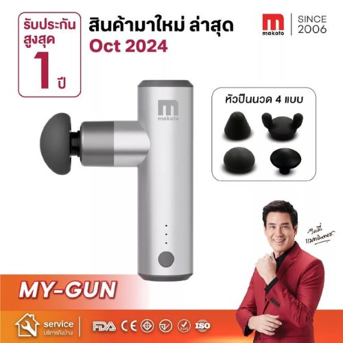 จุดเด่นสำคัญของ Makoto My Gun คือชุดหัวนวดซิลิโคน 4 รูปแบบที่สามารถเปลี่ยนใช้งานได้ตามความต้องการของเนื้อเยื่อและบริเวณที่ต้องการนวด ไม่ว่าจะเป็นหัวเรียบสำหรับนวดกล้ามเนื้อหลัก หัวบอลสำหรับเนื้อเยื่ออ่อนและกล้ามเนื้อที่ไวต่อการสัมผัส หัวกระสุนที่เจาะลึกไปถึงเนื้อเยื่อตามจุดและข้อต่างๆ และหัวรูปตัว U ที่ออกแบบมาเพื่อการนวดบริเวณคอ กระดูกสันหลัง และเอ็นร้อยหวายโดยเฉพาะ ด้วยคุณสมบัติที่หลากหลายนี้ ทำให้ผู้ใช้สามารถเข้าถึงการนวดบำบัดที่ตรงจุดและมีประสิทธิภาพสูงสุด เพื่อช่วยบรรเทาอาการปวดเมื่อยและเพิ่มการไหลเวียนโลหิตได้อย่างรวดเร็ว