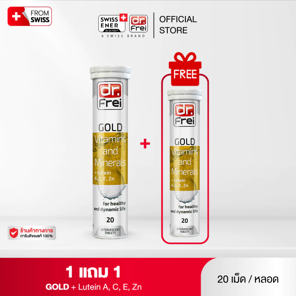 Dr.Frei Gold Vitamin and Minerals + Lutein วิตามินเม็ดฟู่ วิตามินบำรุงสายตา รูปแบบเม็ดฟู่ ที่อัดแน่นไปด้วยวิตามินและแร่ธาตุรวม 25 ชนิด พร้อมลูทีน ช่วยบำรุงสุขภาพแบบองค์รวม เหมาะสำหรับผู้ที่มีอายุ 17 ปีขึ้นไป ที่ต้องการดูแลสุขภาพ แต่มีเวลาจำกัดในการเลือกรับประทานอาหาร หรือผู้ที่ต้องการเสริมวิตามินและแร่ธาตุ Gold Multivitamin ช่วยเสริมสร้างภูมิคุ้มกัน บำรุงผิวพรรณ บำรุงสายตา ลดอาการอ่อนเพลีย และเสริมสร้างพลังงานให้ร่างกายพร้อมรับมือกับทุกกิจกรรมในแต่ละวัน