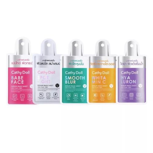 ความหลากหลายของมาส์กชีท Cathy Doll ครอบคลุมการดูแลผิวหลายด้าน เริ่มจากสูตร Spotlight เพื่อผิวกระจ่างใส ที่อุดมด้วยสารสกัดจากบลูเบอร์รี่และ Maqui Berry ที่มีสารต้านอนุมูลอิสระสูง ช่วยลดเลือนจุดด่างดำ ปรับสีผิวให้สม่ำเสมอ ผสานโปรตีนจากน้ำนมให้ผิวเนียนนุ่ม ชุ่มชื่น ส่วนสูตร Hyaluron Serum เน้นการเติมและกักเก็บความชุ่มชื้นด้วยไฮยาลูรอนและ Beta-Glucan ที่ช่วยชะลอการเกิดริ้วรอย ให้ผิวอิ่มน้ำและเรียบเนียน ด้านสูตร Peptide Serum ประกอบด้วยเปปไทด์ 8 โมเลกุล มุ่งเน้นการลดเลือนริ้วรอยร่องลึก เพิ่มความยืดหยุ่น เร่งการผลัดเซลล์ผิว และลดความหมองคล้ำ ให้ผิวแลดูอ่อนเยาว์และกระชับ