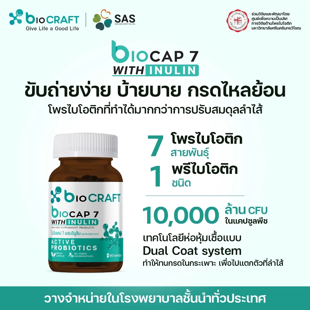 bioCRAFT bioCAP 7 เป็นผลิตภัณฑ์โพรไบโอติกที่น่าสนใจด้วยการเลือกใช้จุลินทรีย์ถึง 7 สายพันธุ์ที่มีงานวิจัยรองรับ โดยเฉพาะการนำสายพันธุ์ไทยมาใช้เพื่อให้เหมาะสมกับสภาพร่างกายและพฤติกรรมการกินของคนในพื้นที่ จุดเด่นที่สำคัญคือเทคโนโลยี Dual Coated System ซึ่งเป็นระบบเคลือบจุลินทรีย์ 2 ชั้น ช่วยปกป้องโพรไบโอติกให้รอดพ้นจากกรดในกระเพาะอาหารและเดินทางไปถึงลำไส้ได้อย่างปลอดภัย ทำให้มั่นใจได้ว่าจุลินทรีย์ที่มีปริมาณสูงกว่า 10,000 ล้านตัว (CFU) จะสามารถทำงานได้อย่างเต็มประสิทธิภาพ